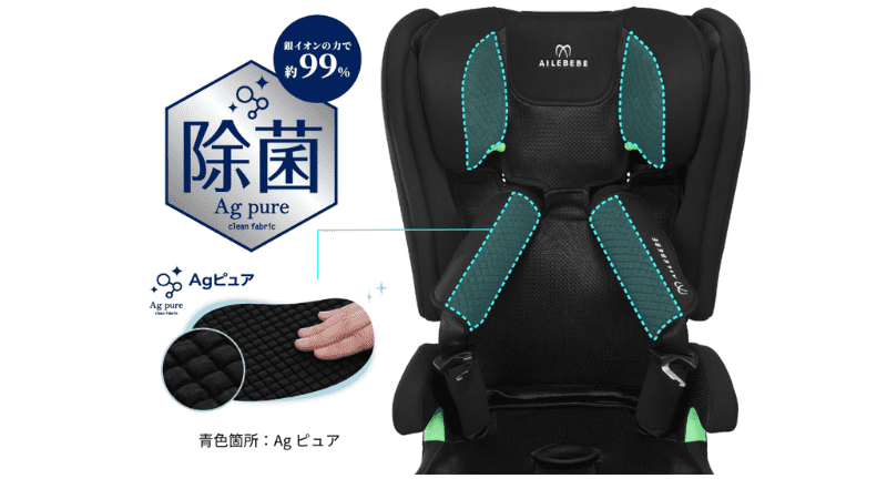 パパットシリーズは銀イオンの力で約99%除菌する生地「Agピュア」を、ヘッドクッション側面、肩パッドの一部に採用しています