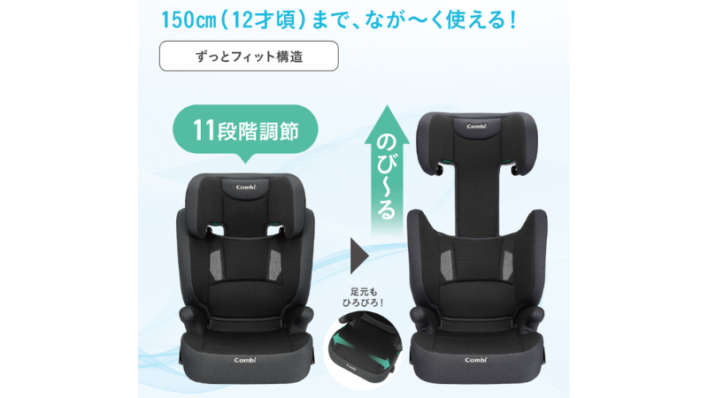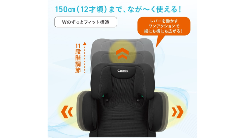 一般的にジュニアシートのヘッドレストは10段階以上調整できる商品が多いので、11段階もあればお子さんの成長に合わせていつも最適な高さに調整してあげられます