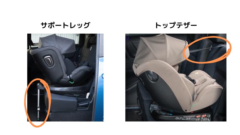 ISOFIXに加えてサポートレッグやトップテザーといった追加の器具を装着することで、重たいチャイルドシートが衝撃で外れるのを防ぎます
