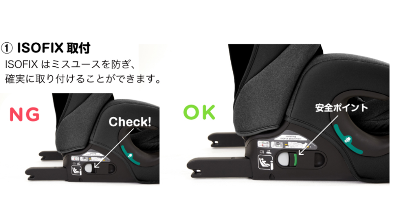 ISOFIXは正しく取付できているかが色でわかる仕様になっているから、誰でも正しい取り付けが可能です