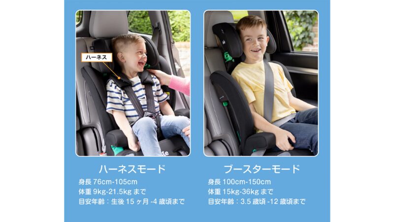身長76~105cmはハーネスモードでまだ小さなお子さんをしっかりガード、3.5歳頃からはハーネスを本体に収納してブースターモードで使用できます