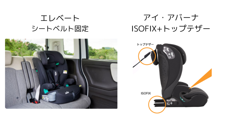 - エレベートはシートベルト固定、アイ・アバーナはISOFIX固定