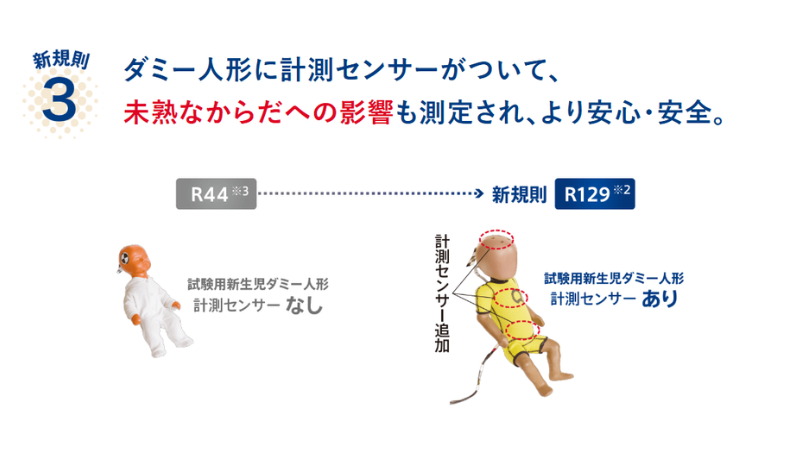 ・衝突試験でセンサー付きダミー人形を使用し、より詳細な負荷が想定可能に